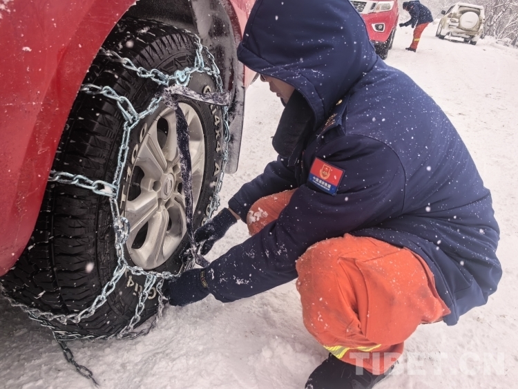 圖為模擬隊(duì)伍機(jī)動(dòng)途中更換防滑鏈。攝影:王澤棟