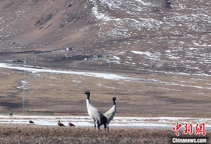 25日,今年首批黑頸鶴如約來到青海玉樹藏族自治州隆寶灘國際重要濕地。