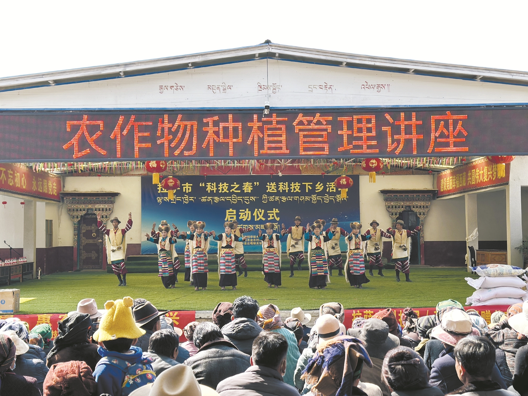 啟動(dòng)儀式結(jié)束后,曲水縣文旅局文藝演出隊(duì)在達(dá)嘎鎮(zhèn)其奴村舉行了以“科技之春·和美其奴文明村風(fēng)”為主題的文藝表演,歌曲、舞蹈等輪番上演,喜慶熱鬧、精彩紛呈,贏得現(xiàn)場(chǎng)觀眾陣陣掌聲。一首《后花園》,歌頌了美麗的自然風(fēng)光,以及勤勞善良的村民,引起觀眾的共鳴。