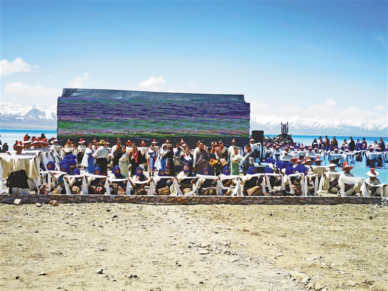 太陽(yáng)漸漸升起,納木錯(cuò)的昏黃一掃而空,一切都明朗起來(lái),巍巍的雪山環(huán)抱著蔚藍(lán)的湖水,大千世界都映襯在水中。在以“情定納木錯(cuò)·百年永相守”為主題的藏式婚禮,伴隨著音樂(lè),99對(duì)新人手捧鮮花,穿過(guò)喜門(mén)入場(chǎng),在藏族歌手和舞者的引領(lǐng)下緩緩步入婚禮現(xiàn)場(chǎng)。悠揚(yáng)動(dòng)聽(tīng)的牧區(qū)山歌以對(duì)唱的形式講述念青唐古拉山和納木錯(cuò)的浪漫愛(ài)情故事,接受祝福、宣讀誓言、互換信物,身著藏袍的新人們臉上充滿(mǎn)喜悅和期待,巍峨雪山見(jiàn)證新人們彼此一生中最重要的承諾。