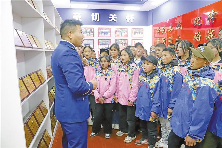 圖為消防員為師生們講解隊伍榮譽。記者 貢秋曲措 攝