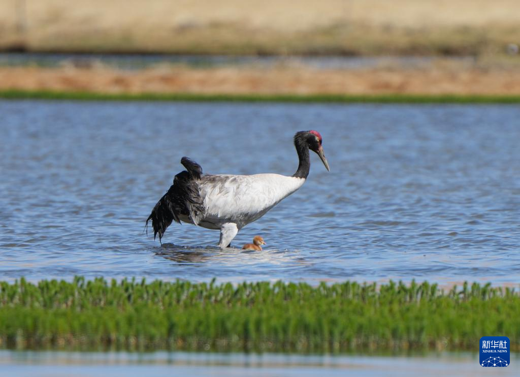 6月9日,一對(duì)黑頸鶴夫婦帶著雛鳥在西藏那曲市申扎縣一處濕地棲息、覓食。新華社記者 晉美多吉 攝