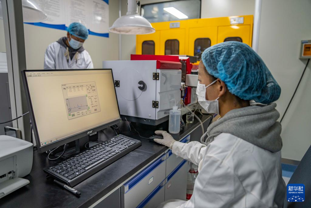 在聶榮縣嘎確生態(tài)畜牧業(yè)發(fā)展有限責(zé)任公司,檢驗(yàn)員達(dá)娃卓瑪在檢測奶制品(5月13日攝)。新華社記者 孫非 攝