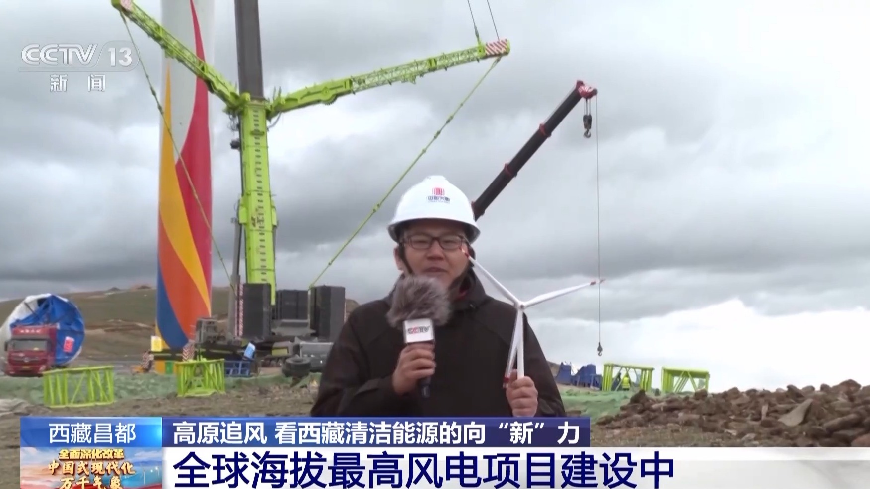 總臺記者 蔣勇:我現(xiàn)在是在西藏昌都市八宿縣全球海拔最高的風(fēng)電項目——八宿風(fēng)電的施工現(xiàn)場。這里的平均海拔達到5050米,最高處接近5200米。如果加上風(fēng)機自身的高度,風(fēng)機的最高海拔將達到5300米。西藏清潔能源十分豐富,而風(fēng)能資源主要集中在5000米以上的超高海拔地區(qū)。