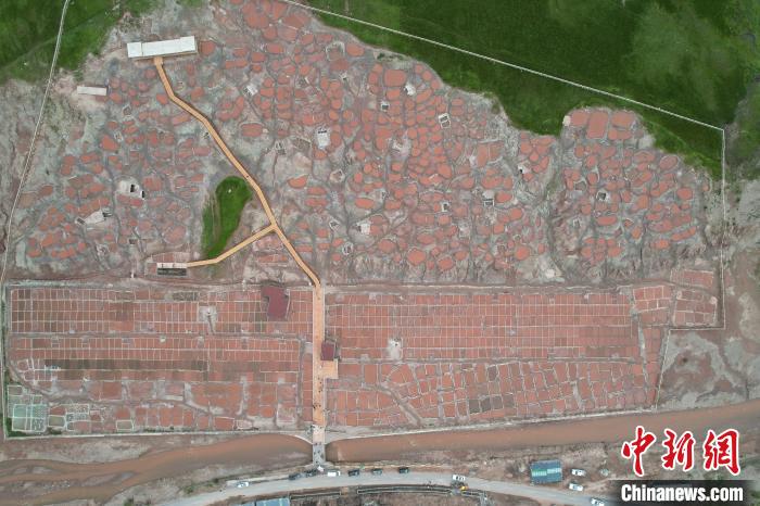 圖為航拍囊謙縣白扎鹽場,大大小小褐色鹽畦形如水田。祁妙攝
