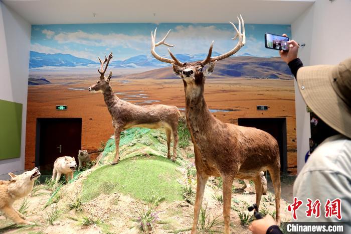 7月24日,參加“中國式現(xiàn)代化的萬千氣象·網(wǎng)絡(luò)名人青海行”活動的網(wǎng)絡(luò)名人,抵達(dá)江河源頭青海玉樹藏族自治州,在玉樹州博物館一覽自然與人文之美。玉樹州博物館是玉樹地震災(zāi)后重建十大標(biāo)志性建筑之一,分為序廳、自然展區(qū)、人文展區(qū)、臨時(shí)展廳。其通過實(shí)物標(biāo)本等方式,展示了三江源和可可西里的野生動物、草地、森林,以及玉樹州的歷史、建筑、服飾、飲食等。圖為玉樹州博物館內(nèi)的野生動物展示。中新社記者 張?zhí)砀?攝