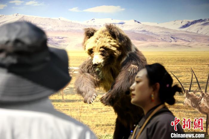 7月24日,參加“中國式現(xiàn)代化的萬千氣象·網(wǎng)絡(luò)名人青海行”活動的網(wǎng)絡(luò)名人,抵達(dá)江河源頭青海玉樹藏族自治州,在玉樹州博物館一覽自然與人文之美。玉樹州博物館是玉樹地震災(zāi)后重建十大標(biāo)志性建筑之一,分為序廳、自然展區(qū)、人文展區(qū)、臨時(shí)展廳。其通過實(shí)物標(biāo)本等方式,展示了三江源和可可西里的野生動物、草地、森林,以及玉樹州的歷史、建筑、服飾、飲食等。圖為工作人員介紹棕熊等野生動物分布情況。中新社記者 張?zhí)砀?攝