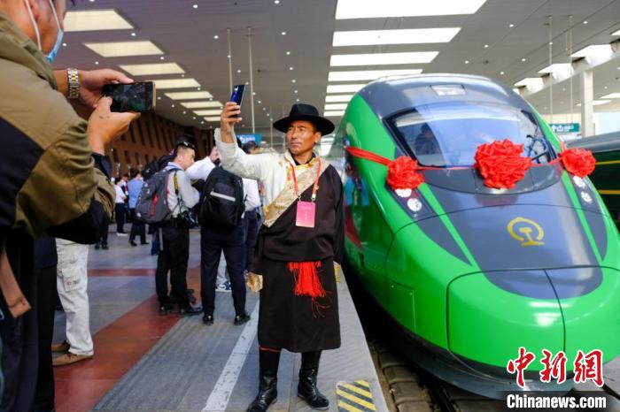 資料圖為2021年6月25日,西藏拉林鐵路開通運(yùn)營(yíng),拉薩曲水縣三有村村民次旦平措在復(fù)興號(hào)前拍照留念。記者 江飛波 攝