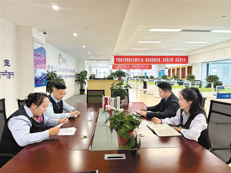 圖為拉薩市行政審批和便民服務局工作人員對12345疑難工單進行討論。記者 盧文靜 攝