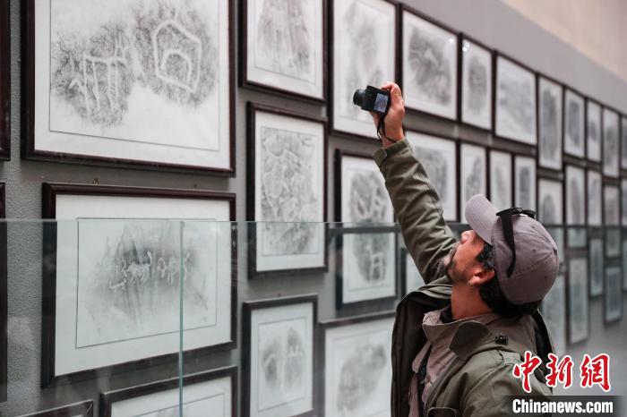 圖為受邀參加活動(dòng)的外國(guó)攝影師在玉樹州博物館內(nèi)拍攝巖畫。薛蒂 攝