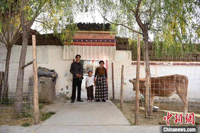 柳果村村民普瓊與家人在自家門前留影。中新網(wǎng)記者 貢確 攝