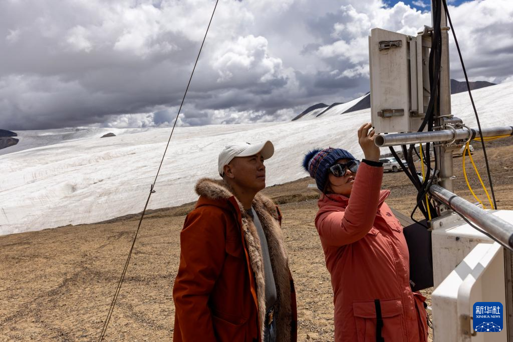 科研人員牛曉偉(右)在冰川末端調試大氣采樣儀器(9月2日攝)。新華社記者 姜帆 攝