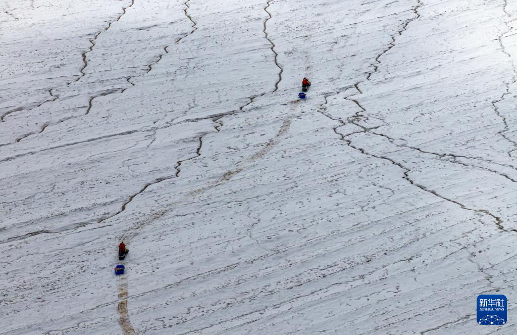 科考隊員搭乘雪地摩托前往冰原深處作業(yè)(無人機照片,9月4日攝)。新華社記者 姜帆 攝