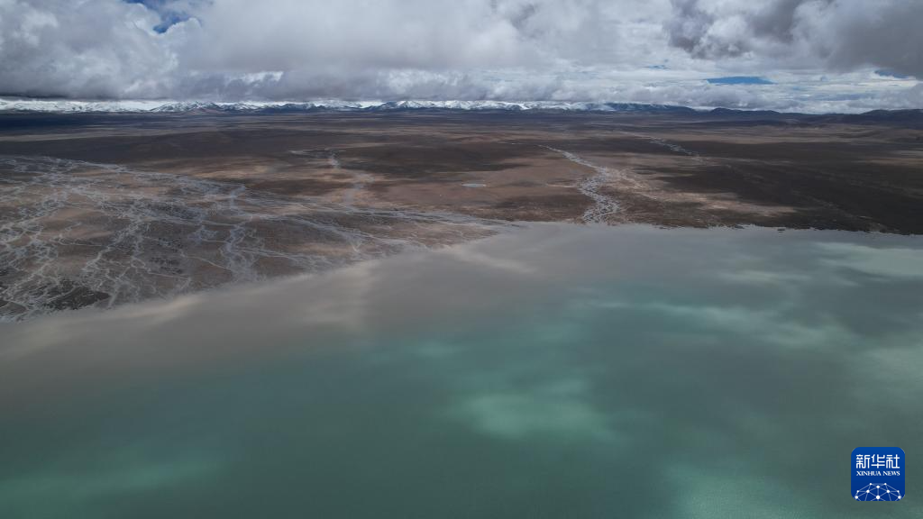 這是9月4日拍攝的普若崗日冰原8號冰川、消融形成的徑流以及遠(yuǎn)處的令戈錯(無人機(jī)拼接照片)。新華社記者 姜帆 攝
