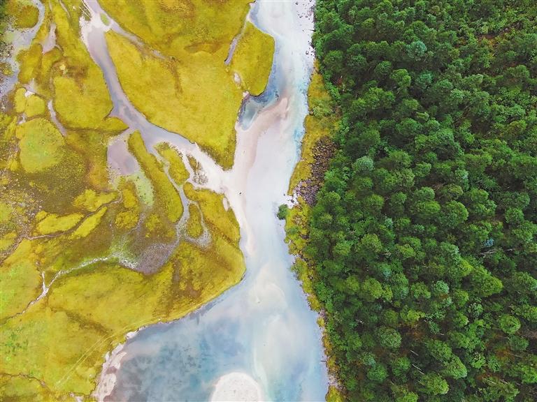 圖為航拍林芝市巴宜區(qū)魯朗鎮(zhèn)達才錯附近的森林與濕地風景。文/圖 記者 謝筱純 王珊