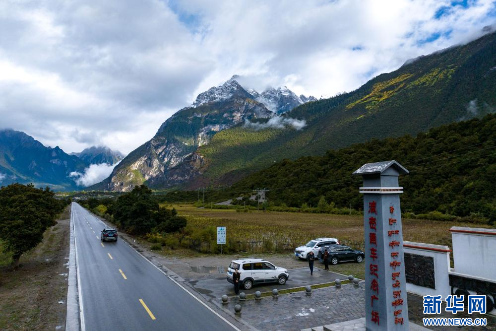 10月11日拍攝的波密通車紀念廣場(無人機照片)。2020年,西藏波密縣通過查閱文獻史料、比對老照片、咨詢當?shù)乩先?、遠程連線老一輩同志等方式,考證出當時舉行通車典禮的地點為今波密縣松宗鎮(zhèn)角達村國道318旁。為紀念這一歷史事件,2021年4月波密縣在此處修建了波密通車紀念廣場。新華網(wǎng) 旦增努布 攝