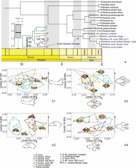 江左其杲指出,結(jié)合DNA序列和形態(tài)學(xué)數(shù)據(jù),研究團隊推斷豹屬的系統(tǒng)發(fā)育,支持5例化石記錄的確屬于現(xiàn)生雪豹支系,且它們相對現(xiàn)生雪豹組成并系群,表明這些青藏高原之外的雪豹并非獨立于現(xiàn)生雪豹的一個分支,而是不斷從雪豹主干上分出的小分支,說明它們很有可能代表雪豹多次在特定時間段走出青藏高原的記錄,而這些記錄共同組成了雪豹演化的幾個斷面,從而得以揭秘雪豹如何一步步特化。