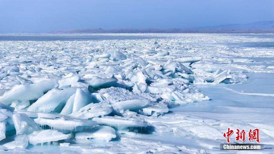 2月13日,青海省海南藏族自治州青海湖南岸,堆積在岸邊的冰塊在光線照射下呈藍(lán)冰景象,與周邊雪山、藍(lán)天、沙漠等大自然景色巧妙融合,吸引游客和攝影愛好者前來觀賞。圖為航拍青海湖藍(lán)冰。
