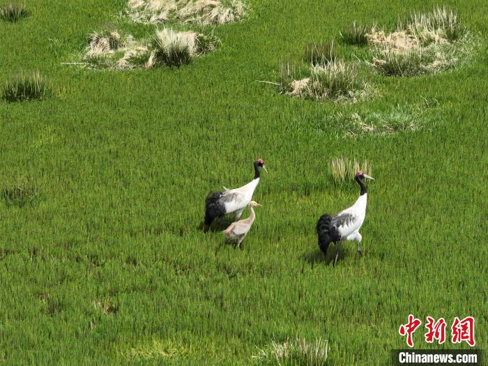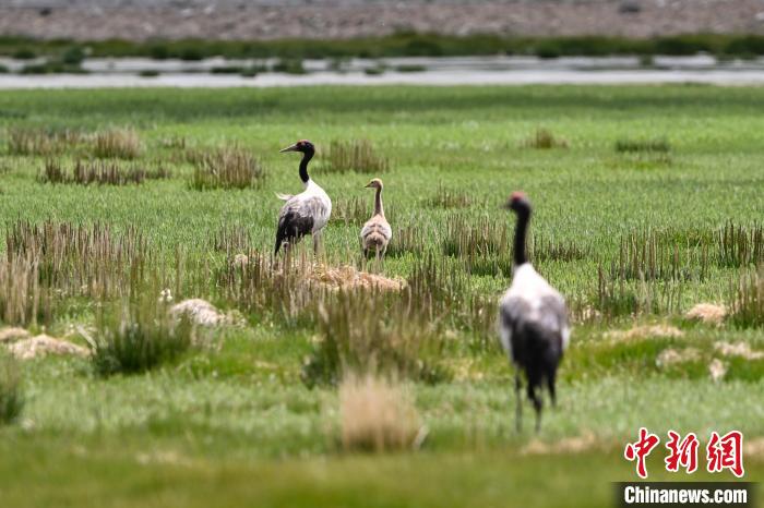 7月10日,在海拔4700米的西藏自治區(qū)那曲市申扎縣濕地里,黑頸鶴一家在悠閑覓食。中新社記者 貢嘎來松 攝