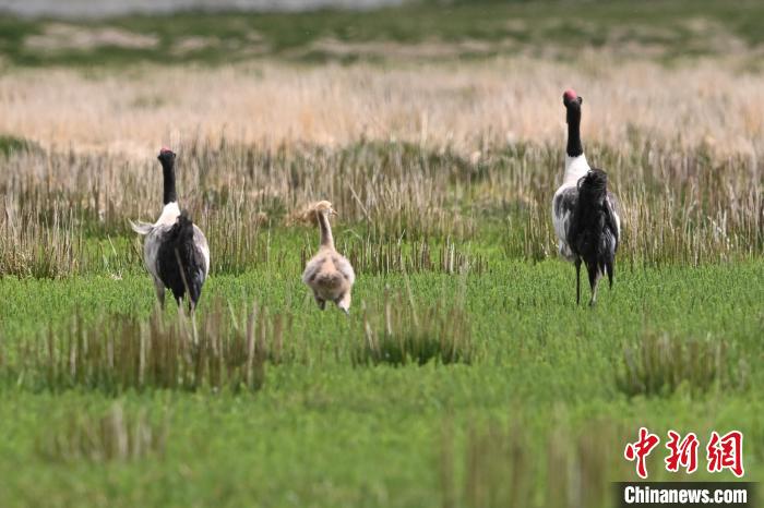 7月10日,在海拔4700米的西藏自治區(qū)那曲市申扎縣濕地里,黑頸鶴一家在悠閑覓食。黑頸鶴是中國國家一級重點保護野生動物,屬高原特有鶴類,主要棲息于海拔2500米至5000米的高原沼澤地、湖泊及河灘等濕地環(huán)境。每年四月起,成對的黑頸鶴陸續(xù)飛抵西藏自治區(qū)那曲市申扎縣,在此繁育后代。近年來,申扎縣持續(xù)加強生態(tài)修復,濕地面積擴大、水質(zhì)改善,為黑頸鶴等珍稀物種提供了理想家園。中新社發(fā) 毛建軍 攝