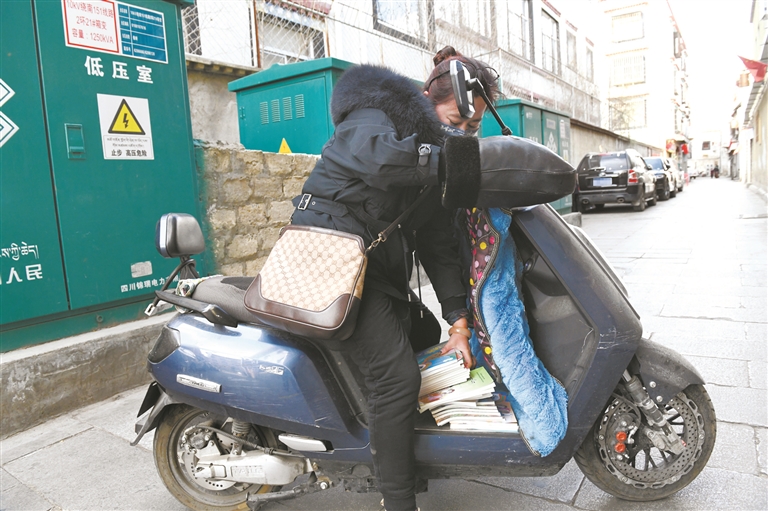圖為城關(guān)區(qū)第二小學(xué)三年級(11)班班主任旦增色珍騎著電動(dòng)車把分類分揀好的教材送到學(xué)生家中。