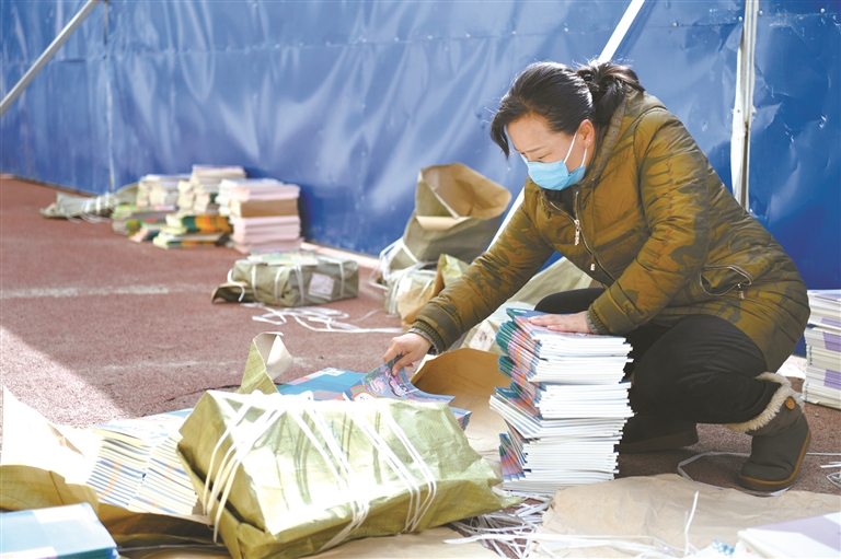 圖為城關(guān)區(qū)雪小學(xué)一年級(3)班次旦卓嘎老師在分揀本班教材。(本組圖片由拉薩融媒視覺組攝)