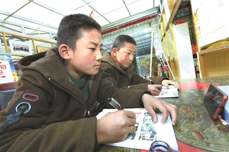 為在西藏拉薩市墨竹工卡縣甲瑪鄉(xiāng)孜孜榮村兩名中學生通過釘釘軟件上網課。由墨竹工卡縣委宣傳部洛克攝