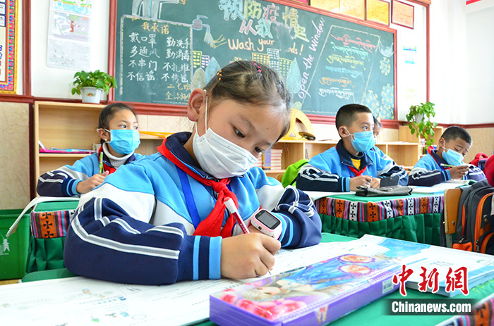 4月15日,玉樹市第三完全小學(xué)的學(xué)生在課堂上做筆記。中新社記者 魯?shù)り?攝