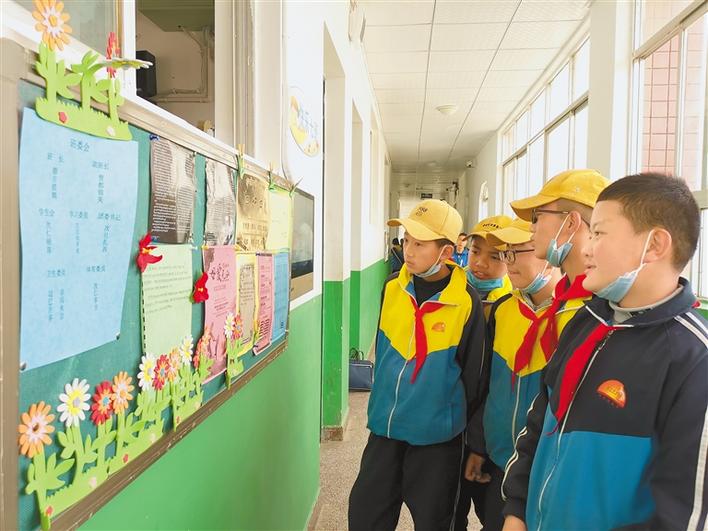 圖為桑珠孜區(qū)第二中學(xué)初二學(xué)生在教師走廊參觀學(xué)習(xí)班級(jí)動(dòng)態(tài)展板。 記者 扎西頓珠 攝