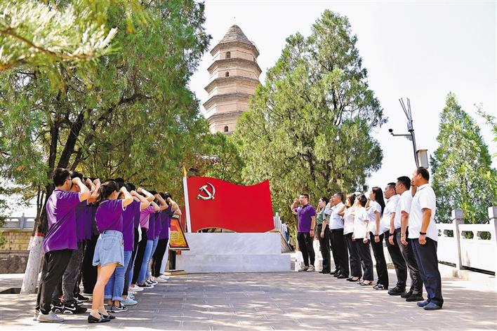 6月29日,黨員干部在延安市寶塔山重溫入黨誓詞。新華社記者 張博文 攝