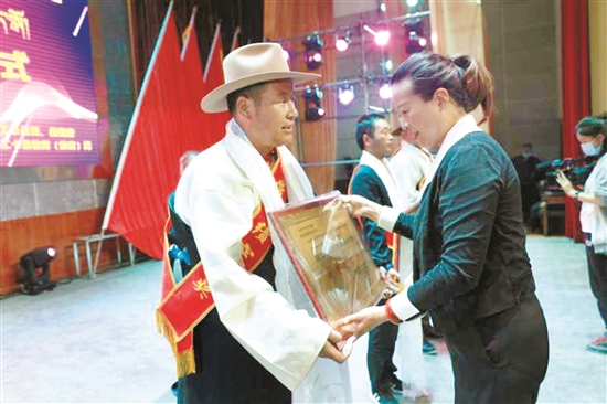 圖為墨竹工卡縣相關(guān)負責(zé)人為受表彰者頒獎。 拉薩融媒通訊員 洛 克攝