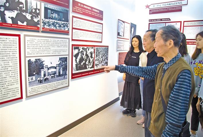 圖為展覽館內(nèi),吳逢箴教授(右一)和顧祖成教授(右二)向?qū)W生們介紹西藏民族大學(xué)校史。同東放 攝