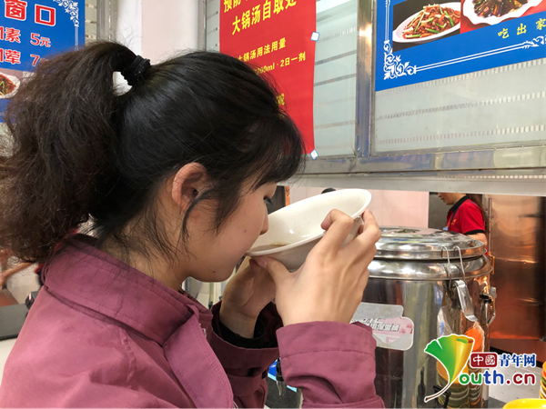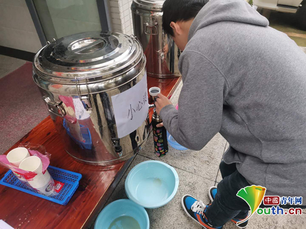 圖為學生正在飲用“大鍋湯”。中國青年網(wǎng)通訊員 沈萌萍 攝