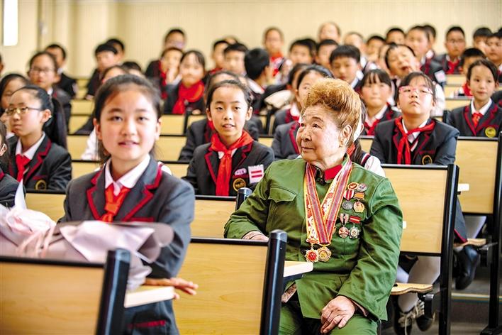 圖為抗美援朝老戰(zhàn)士楊秀珍與云大附中星耀學校小學部師生一同參加抗美援朝英雄故事分享會。新華社記者 江文耀 攝