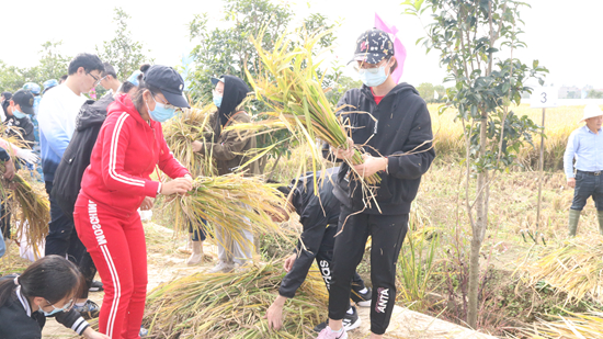 同學(xué)們在田間割稻谷。武漢大學(xué)生科院供圖