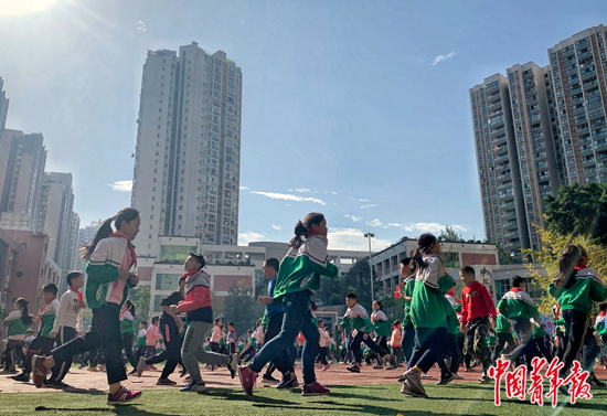 四川成都電子科技大學(xué)附屬實(shí)驗(yàn)小學(xué)的學(xué)生在進(jìn)行體育鍛煉。梁璇/攝