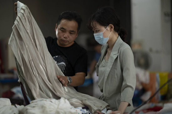 圖為劉童童(右)在漢服工廠內(nèi)研究漢服布料設(shè)計、制作細(xì)節(jié)。受訪者供圖