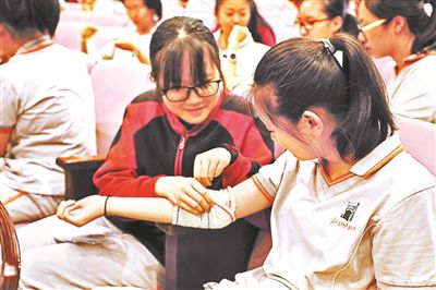 練習(xí)急救包扎(資料圖) 供圖/北師大附中