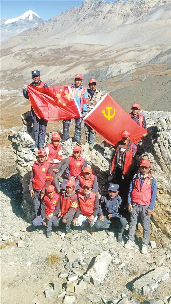 圖為吉隆縣貢當(dāng)鄉(xiāng)樟村黨員先鋒隊(duì)在通外山口巡邏過(guò)程中與國(guó)旗、黨旗合影。索朗瓊珠 次仁片多 攝