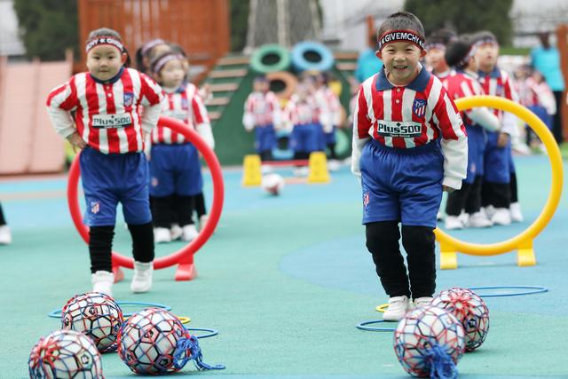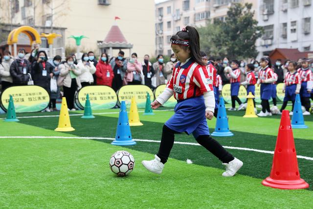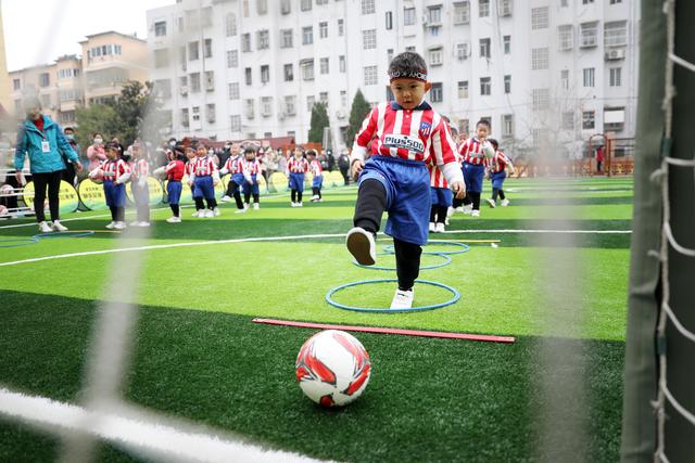 12月7日,淮北市第二實驗幼兒園的小朋友在足球課上學(xué)習(xí)踢足球。