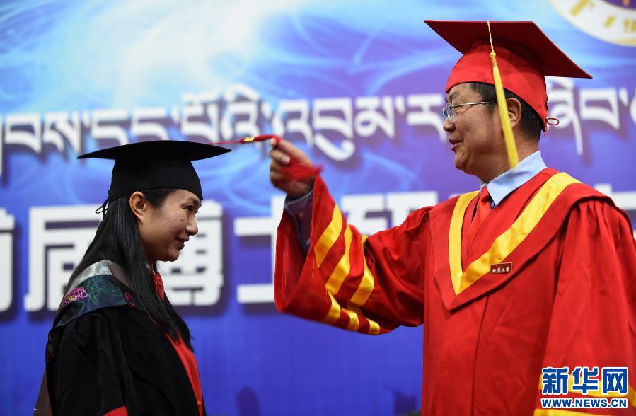 2017年11月10日,西藏大學(xué)舉行首屆博士研究生畢業(yè)典禮,向4名畢業(yè)生授予博士學(xué)位。圖為西藏大學(xué)校長紀建洲給博士畢業(yè)生張慧撥流蘇。新華社記者 覺果 攝