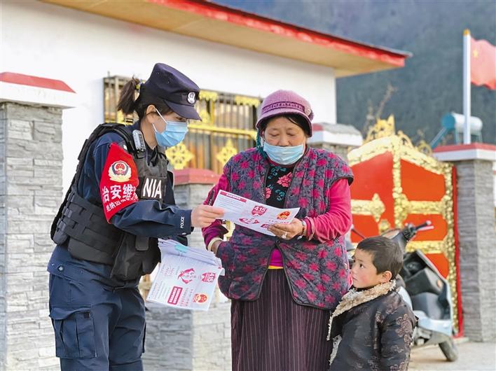 圖為林芝邊境管理支隊(duì)羌納邊境派出所民警為群眾發(fā)放國(guó)家安全教育宣傳手冊(cè)。孫彪 張猛 攝
