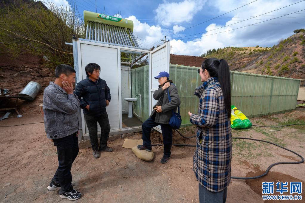 5月2日,李純民趕到西藏昌都市類烏齊縣濱達鄉(xiāng)濱達村,為當?shù)卮迕裣虬桶偷菂f(xié)調(diào)太陽能熱水器的安裝調(diào)試工作。這是李純民(右二)通過濱達鄉(xiāng)小學老師索朗卓瑪(右一)作藏語翻譯,就熱水淋浴室與水沖廁整體改造計劃給向巴巴登(左二)提出建議。新華社記者 劉金海 攝