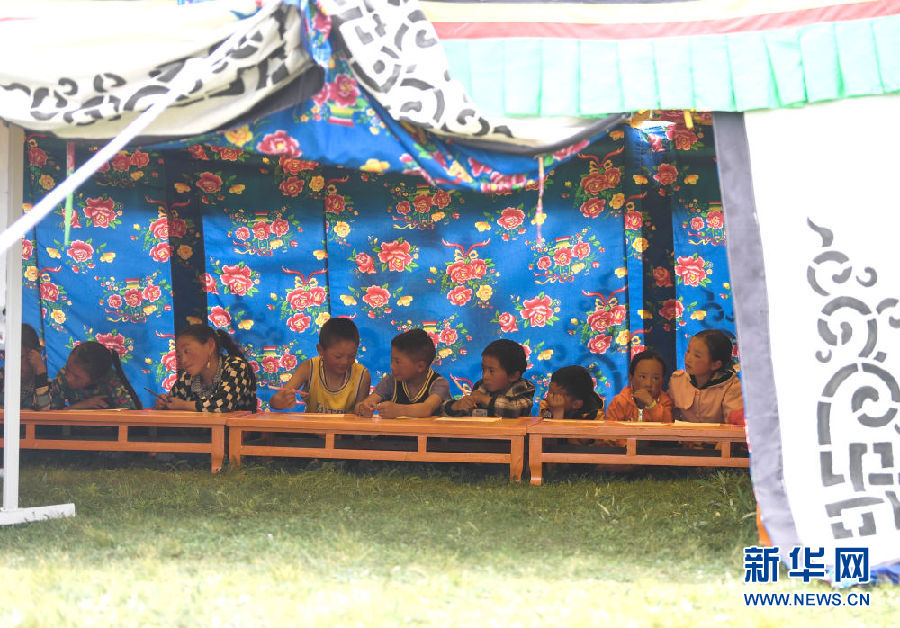 8月2日,在青海省果洛藏族自治州瑪沁縣下大武鄉(xiāng)年扎村“育苗加油站”的帳篷里,小朋友們?cè)谶M(jìn)行繪畫。新華社記者 張龍 攝