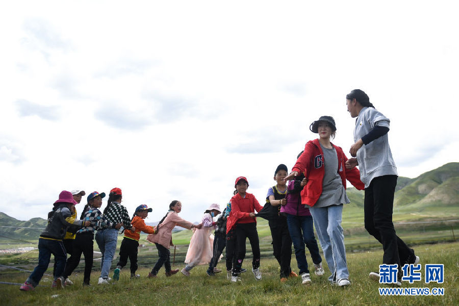 8月2日,在青海省果洛藏族自治州瑪沁縣下大武鄉(xiāng)年扎村的“育苗加油站”,孩子們?cè)谝黄鹜嬗螒?。新華社記者 張龍 攝
