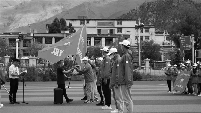 共青團(tuán)西藏自治區(qū)委員會(huì)副書記何華向各市地志愿者隊(duì)伍授旗。圖由團(tuán)區(qū)委提供