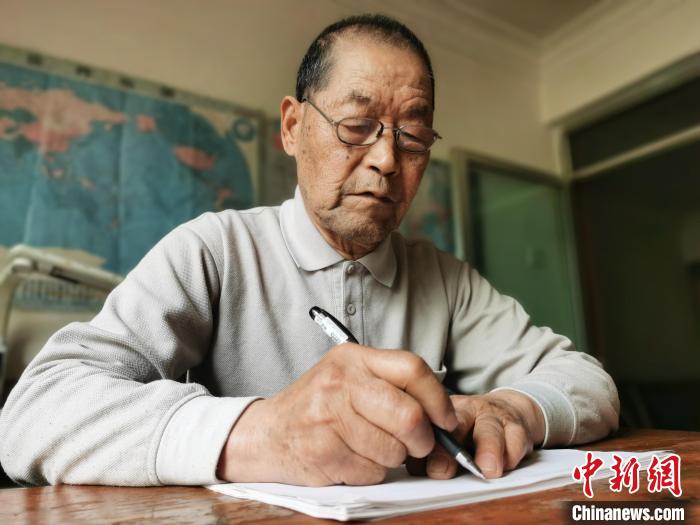 圖為在青海西寧頤養(yǎng)天年的朱汝完向記者展示氣象發(fā)報(bào)基本功?!?zhí)砀?攝