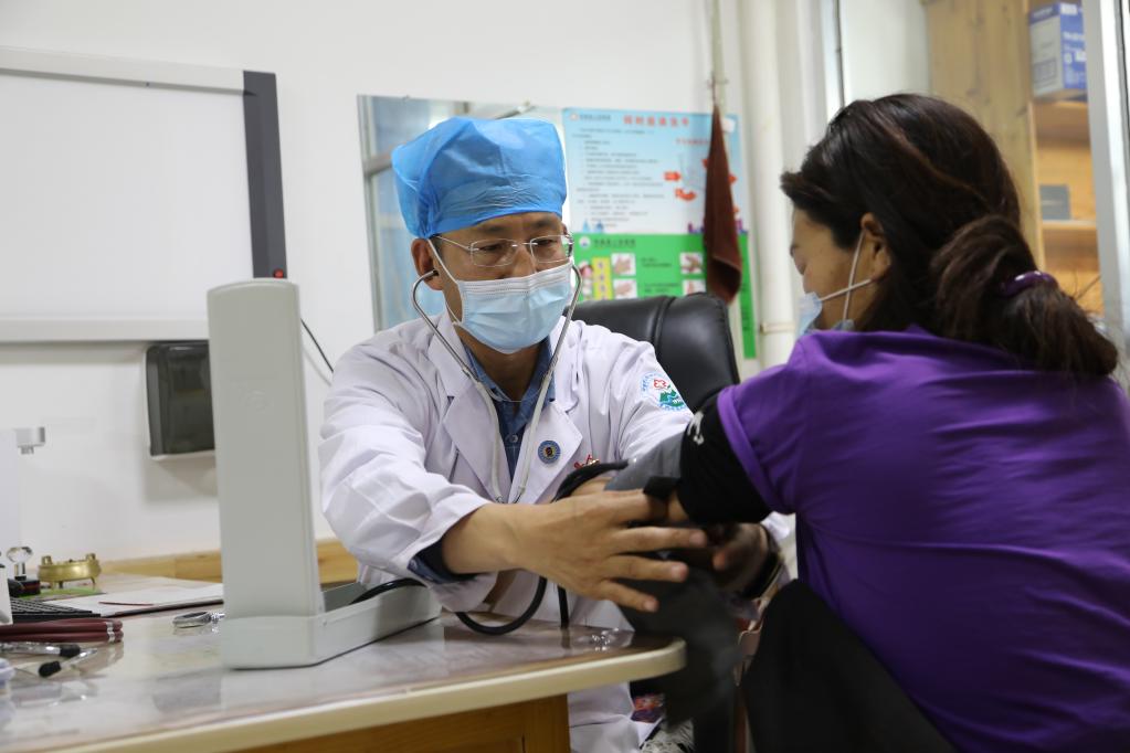 在瑪曲縣人民醫(yī)院,王團勝為患者看病。新華社記者 馬莎 攝