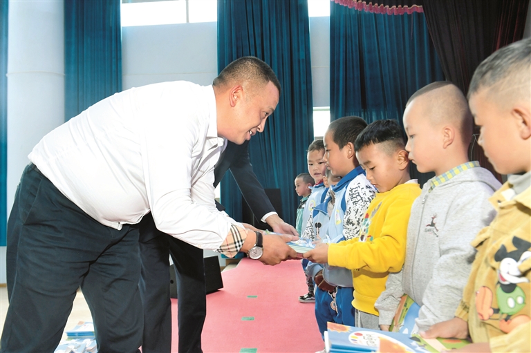 圖為尼瑪次仁將圖書送到幼兒手中。拉薩融媒記者 巴桑次仁攝