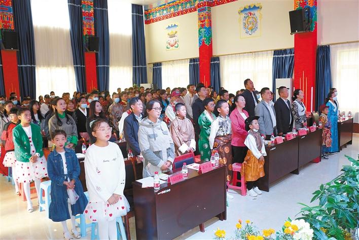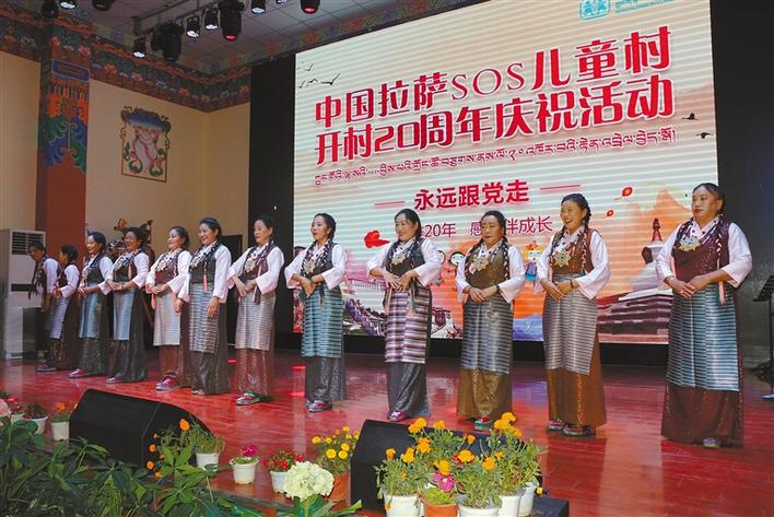 在中國(guó)拉薩SOS兒童村開(kāi)村20周年慶?;顒?dòng)上,SOS村全體干部職工和孩子們共唱國(guó)歌。